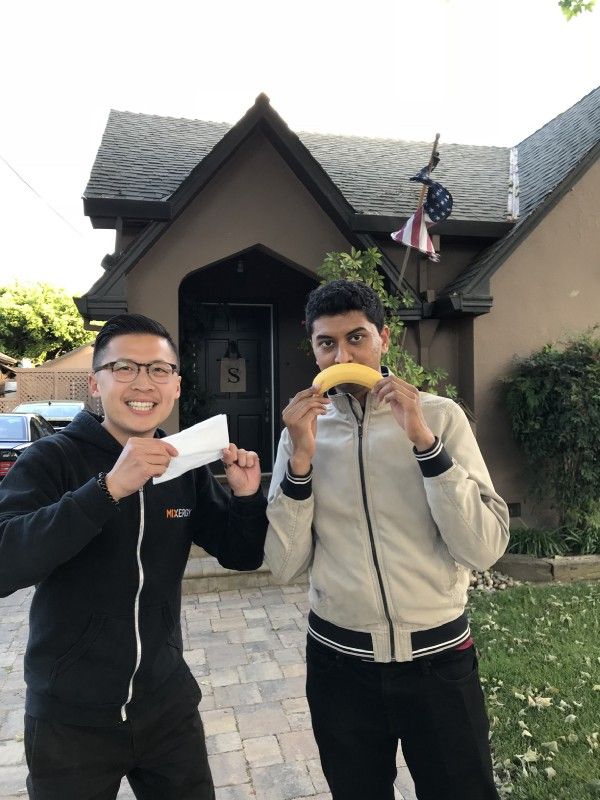 3rd house — We meet an elderly man who had a sports t-shirt on and Brandon makes the ask. The man came out with a banana. We were so ecstatic.
