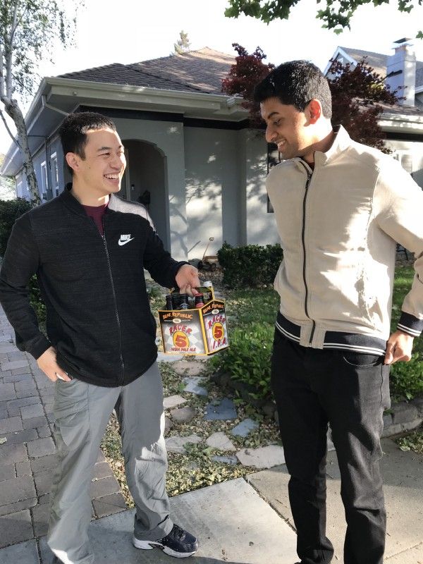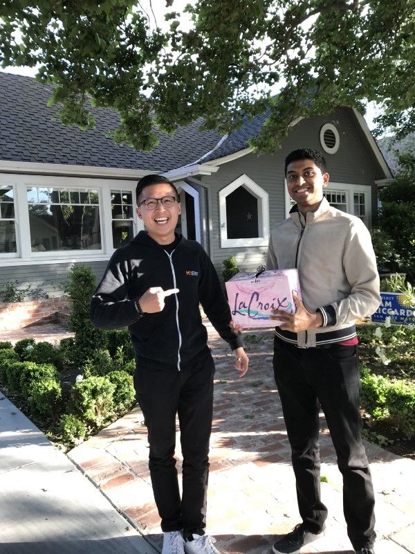 6th house — We meet a dad of two teenage kids who is patient and curious about our pitch. He chuckles and his whole family starts to find things around the house to contribute to the game. The son comes out of the garage with a 12-pack of La Croix.