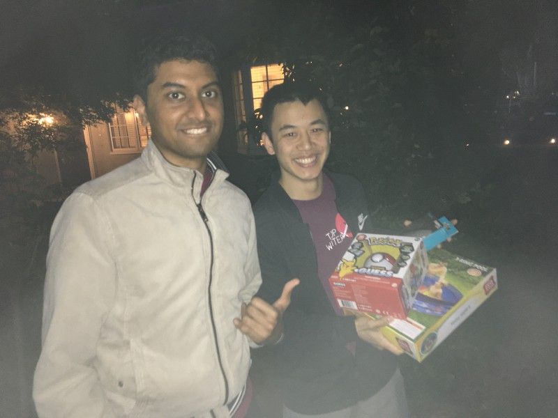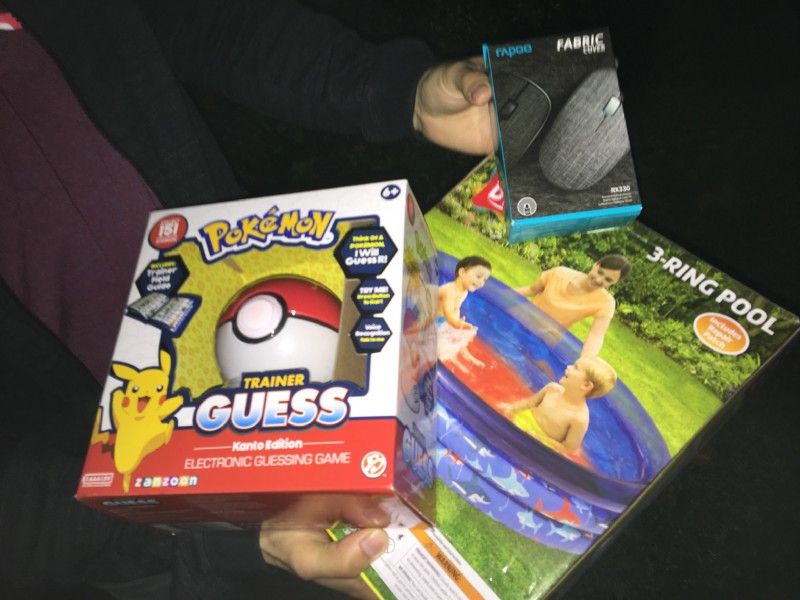 We hand him the inflatable pool, Pokemon catcher, and wireless mouse. He is ecstatic. He let us know that his grandkids would love this. He thanks us and we say goodbye.